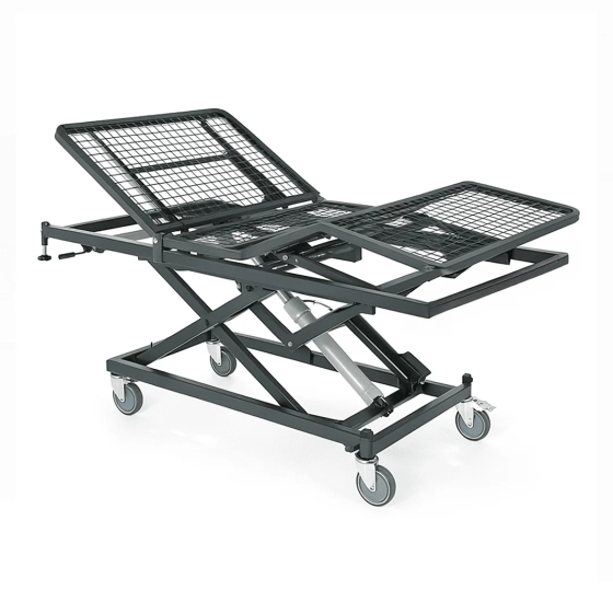 Conjunto para Alzheimer asistencial de 4 planos, 3 con articulación y elevación eléctrica desmontable y autoportante sin necesidad de herramientas. Posee espacios para incorporador y portasueros y mando dotado de llave para bloqueo de funciones.